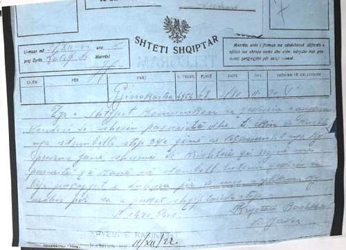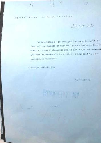 «Αργυρόκαστρο. Αρ. Τηλεγραφήματος 4954. Λέξεις 68. Ημερομ. 9/12. Ώρα 11 Το Γραφείο Τύπου κάνει γνωστό ότι η Κυβέρνηση της Άγκυρας αποφάσισε να πωλήσουν τις περιουσίες τους και να φύγουν οι Χριστιανοί απ’ την Κωνσταντινούπολη.στοπ. Δεδομένου ότι από τούτη της περιοχή είναι πολλοί Χριστιανοί που ζουν με τις ακίνητες περιουσίες που κατέχουν στην Κωνσταντινούπολη παρακαλούμε την Κυβέρνηση όπως προβεί στα ενδεικνυόμενα διαβήματα ώστε να μην εφαρμοστεί η διάταξη αυτή σε ότι αφορά στους Αλβανούς. στοπ.