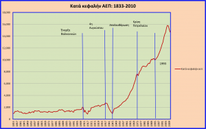 Η πρώτη μάχη μεταξύ των δυο «Ελλάδων» δίνεται αμέσως μετά την απελευθέρωση. Η μια Ελλάδα, του Καποδίστρια, περιλαμβάνει μεταξύ άλλων τους Έλληνες της διασποράς και τους Φαναριώτες που ήλθαν στην Ελλάδα. Η άλλη Ελλάδα περιλαμβάνει τις ομάδες συμφερόντων που αντιπροσώπευαν οι υπέρμαχοι της διατήρησης τους προϋπάρχοντος status quo, με κύριους εκπροσώπους την προτεραία «άρχουσα» τάξη όπως οι Μαυρομιχαλαίοι κ.α. Η δολοφονία του Καποδίστρια οδηγεί στην επικράτηση των ομάδων συμφερόντων της συντήρησης και της διατήρησης ενός παραγωγικού μοντέλου που ήταν συνέχεια αυτού των τελευταίων δεκαετιών της Οθωμανικής κυριαρχίας. Η συνήθης άσκηση της πολιτικής από το Ελληνικό κράτος είχε χαρακτήρα ιδιαίτερα λαϊκίστικό, με κύριο εκπρόσωπο τον Θ. Δηλιγιάννη. Όπως φαίνεται στο διάγραμμα, το κατά κεφαλήν ΑΕΠ, ως δείκτης του βιοτικού επιπέδου της χώρας, αυξήθηκε πολύ αργά, μέσος ετήσιος ρυθμός ανάπτυξης από το 1833 έως το 1910 1,1%.
