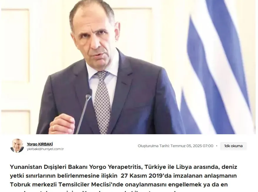 Ο Έλληνας υπουργός Εξωτερικών, Γιώργος Γεραπετρίτης, ξεκινά περιοδεία στη Λιβύη με στόχο την αποτροπή ή τουλάχιστον την καθυστέρηση της έγκρισης της συμφωνίας που υπεγράφη μεταξύ Τουρκίας και Λιβύης για την οριοθέτηση των θαλάσσιων συνόρων στις 27 Νοεμβρίου 2019, στη Βουλή των Αντιπροσώπων με έδρα το Τομπρούκ.