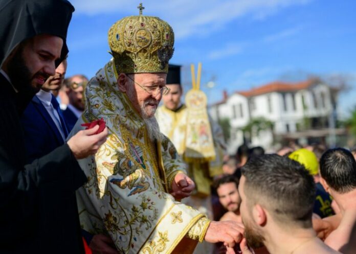 Ο Οικουμενικός Πατριάρχης Βαρθολομαίος Ι ευλογεί έναν Έλληνα ορθόδοξο κολυμβητή κατά τις εορταστικές εκδηλώσεις των Θεοφανείων στην Κωνσταντινούπολη στις 6 Ιανουαρίου 2024. Ανάλογες εκδηλώσεις για τα Θεοφάνεια πραγματοποιούνται σε όλη τη χώρα και την περιοχή σε όχθες ποταμών, παραθαλάσσιες περιοχές και λίμνες. (Φωτογραφία: YASIN AKGUL / AFP)