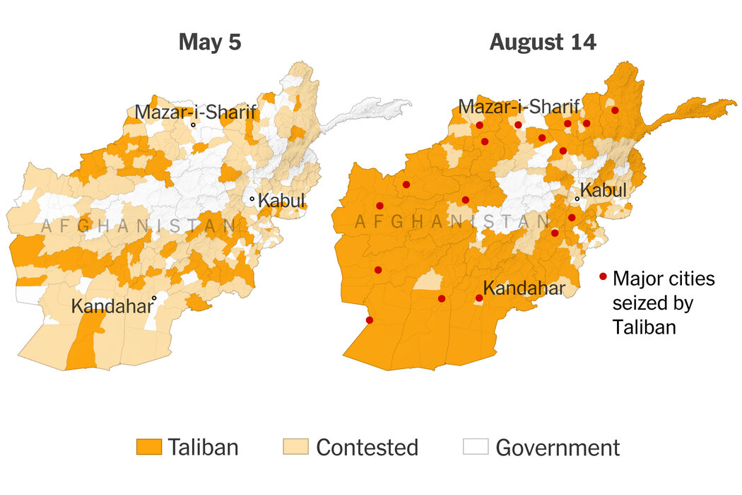 Η επέλαση των Ταλιμπάν αποτυπώνεται στον χάρτη που δημοσίευσαν οι New York Times. Δείτε τι είχαν υπό τον έλεγχο τους οι Ταλιμπάν στις 5 Μαίου και που είχαν φθάσει μέχρι χθες! Αποτυπώνεται επίσης η ήττα της αμερικανικής πολιτικής στη χώρα.