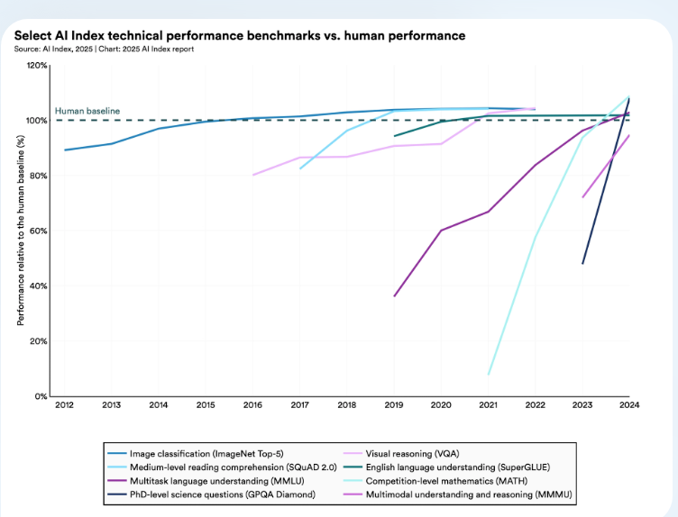 Το 2023, οι ερευνητές παρουσίασαν νέα πρότυπα αξιολόγησης—MMMU, GPQA και SWE-bench—για να δοκιμάσουν τα όρια των προηγμένων συστημάτων ΤΝ. Μόλις έναν χρόνο αργότερα, η απόδοση αυξήθηκε κατακόρυφα: τα σκορ ανέβηκαν κατά 18,8, 48,9 και 67,3 ποσοστιαίες μονάδες στα MMMU, GPQA και SWE-bench, αντίστοιχα. Πέρα από τα πρότυπα, τα συστήματα ΤΝ σημείωσαν σημαντική πρόοδο στη δημιουργία βίντεο υψηλής ποιότητας, ενώ σε ορισμένες περιπτώσεις, πράκτορες γλωσσικών μοντέλων ξεπέρασαν ακόμη και ανθρώπους σε προγραμματιστικά καθήκοντα με περιορισμένους χρονικούς πόρους.