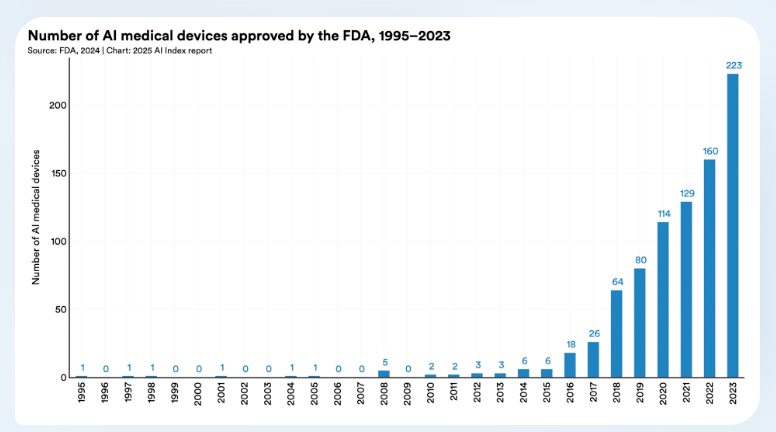 Από την υγειονομική περίθαλψη μέχρι τις μεταφορές, η ΤΝ μετακινείται με ταχύ ρυθμό από τα ερευνητικά εργαστήρια στην καθημερινότητα. Το 2023, ο FDA ενέκρινε 223 ιατρικές συσκευές με δυνατότητες ΤΝ, έναντι μόλις έξι το 2015. Στους δρόμους, τα αυτοκινούμενα οχήματα δεν είναι πλέον πειραματικά: η Waymo, ένας από τους μεγαλύτερους παρόχους στις ΗΠΑ, προσφέρει πάνω από 150.000 αυτόνομες διαδρομές την εβδομάδα, ενώ ο οικονομικός στόλος ρομποταξί Apollo Go της Baidu εξυπηρετεί πλέον πολλές πόλεις σε όλη την Κίνα.