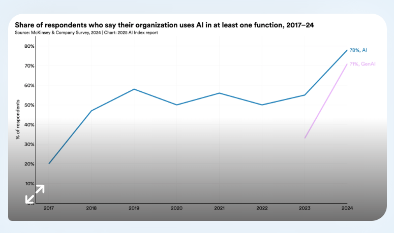 Το 2024, οι ιδιωτικές επενδύσεις στην ΤΝ στις ΗΠΑ ανήλθαν σε 109,1 δισεκατομμύρια δολάρια — σχεδόν 12 φορές περισσότερο από τα 9,3 δισεκατομμύρια της Κίνας και 24 φορές πάνω από τα 4,5 δισεκατομμύρια του Ηνωμένου Βασιλείου. Η γενετική ΤΝ παρουσίασε ιδιαίτερη δυναμική, προσελκύοντας 33,9 δισεκατομμύρια δολάρια παγκοσμίως σε ιδιωτικές επενδύσεις — αύξηση 18,7% σε σύγκριση με το 2023. Η χρήση ΤΝ στις επιχειρήσεις επίσης επιταχύνεται: το 2024, το 78% των οργανισμών δήλωσαν ότι χρησιμοποιούν ΤΝ, έναντι 55% το προηγούμενο έτος. Παράλληλα, αυξανόμενος όγκος ερευνών επιβεβαιώνει ότι η ΤΝ ενισχύει την παραγωγικότητα και, στις περισσότερες περιπτώσεις, συμβάλλει στη μείωση των διαφορών δεξιοτήτων στο εργατικό δυναμικό.