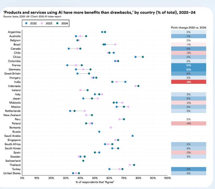 Σε χώρες όπως η Κίνα (83%), η Ινδονησία (80%) και η Ταϊλάνδη (77%), η πλειοψηφία θεωρεί ότι τα προϊόντα και οι υπηρεσίες ΤΝ είναι περισσότερο ωφέλιμα παρά επιβλαβή. Αντιθέτως, η αισιοδοξία παραμένει πολύ χαμηλότερη σε περιοχές όπως ο Καναδάς (40%), οι Ηνωμένες Πολιτείες (39%) και η Ολλανδία (36%). Παρ’ όλα αυτά, το κλίμα αλλάζει: από το 2022, η αισιοδοξία έχει αυξηθεί σημαντικά σε αρκετές χώρες που προηγουμένως εμφανίζονταν σκεπτικιστικές — μεταξύ αυτών η Γερμανία (+10%), η Γαλλία (+10%), ο Καναδάς (+8%), η Μεγάλη Βρετανία (+8%) και οι Ηνωμένες Πολιτείες (+4%).