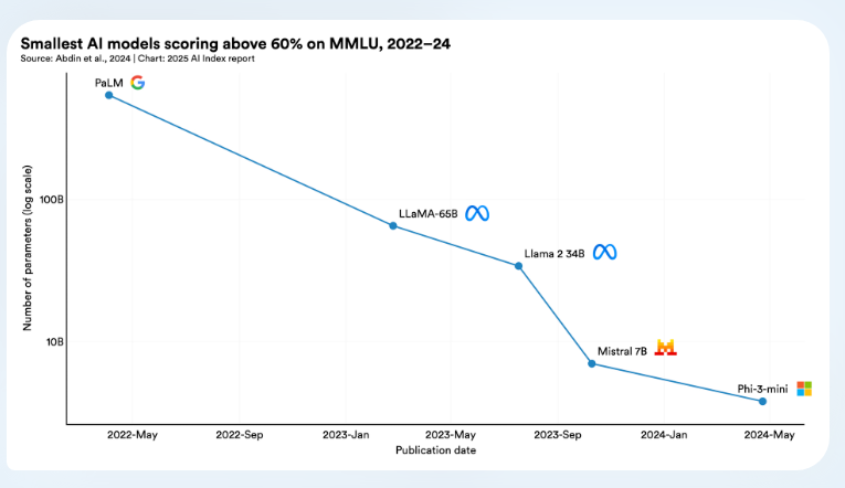 Καθώς αναπτύσσονται ολοένα και πιο ικανά μικρά μοντέλα, το κόστος εκτέλεσης (inference) για ένα σύστημα με απόδοση επιπέδου GPT-3.5 μειώθηκε πάνω από 280 φορές μεταξύ Νοεμβρίου 2022 και Οκτωβρίου 2024. Σε επίπεδο υλικού, το κόστος μειώνεται κατά 30% ετησίως, ενώ η ενεργειακή απόδοση βελτιώνεται κατά 40% κάθε χρόνο. Παράλληλα, τα μοντέλα με ανοιχτά βάρη περιορίζουν τη διαφορά απόδοσης έναντι των κλειστών μοντέλων, μειώνοντας το χάσμα από 8% σε μόλις 1,7% σε ορισμένα πρότυπα αξιολόγησης μέσα σε έναν μόλις χρόνο. Συνολικά, αυτές οι τάσεις μειώνουν ραγδαία τα εμπόδια πρόσβασης στην προηγμένη ΤΝ.