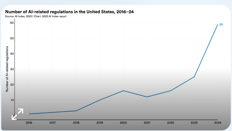 Το 2024, οι ομοσπονδιακές υπηρεσίες των ΗΠΑ εισήγαγαν 59 κανονισμούς σχετικούς με την ΤΝ — πάνω από το διπλάσιο σε σχέση με το 2023 — και εκδόθηκαν από διπλάσιο αριθμό υπηρεσιών. Σε παγκόσμιο επίπεδο, οι νομοθετικές αναφορές στην ΤΝ αυξήθηκαν κατά 21,3% σε 75 χώρες από το 2023, καταγράφοντας εννιαπλάσια αύξηση από το 2016. Παράλληλα με την αυξημένη προσοχή, οι κυβερνήσεις προχωρούν σε μαζικές επενδύσεις: ο Καναδάς δεσμεύτηκε για 2,4 δισεκατομμύρια δολάρια, η Κίνα εγκαινίασε ταμείο 47,5 δισεκατομμυρίων για ημιαγωγούς, η Γαλλία ανακοίνωσε επένδυση €109 δισ., η Ινδία δεσμεύτηκε για 1,25 δισ. δολάρια, και το έργο Transcendence της Σαουδικής Αραβίας αντιστοιχεί σε μια πρωτοβουλία 100 δισεκατομμυρίων δολαρίων.