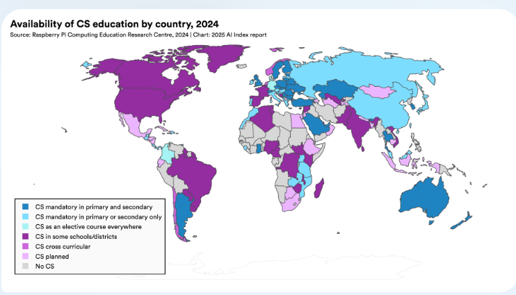 Τα δύο τρίτα των χωρών πλέον προσφέρουν ή σχεδιάζουν να προσφέρουν μαθήματα Πληροφορικής στο σχολείο (K–12) — διπλάσιες σε σύγκριση με το 2019 — με την Αφρική και τη Λατινική Αμερική να σημειώνουν τη μεγαλύτερη πρόοδο. Στις ΗΠΑ, ο αριθμός των αποφοίτων με πτυχία Πληροφορικής αυξήθηκε κατά 22% την τελευταία δεκαετία. Ωστόσο, η πρόσβαση παραμένει περιορισμένη σε πολλές αφρικανικές χώρες λόγω ελλείψεων σε βασικές υποδομές, όπως το ηλεκτρικό ρεύμα. Στις ΗΠΑ, το 81% των καθηγητών Πληροφορικής σε σχολεία (K–12) δηλώνουν ότι η ΤΝ θα έπρεπε να αποτελεί μέρος της βασικής διδασκαλίας Πληροφορικής, όμως λιγότεροι από τους μισούς αισθάνονται κατάλληλα προετοιμασμένοι να τη διδάξουν.