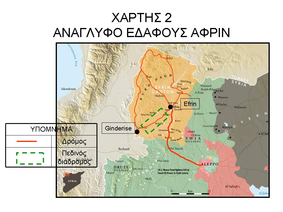 Από την μελέτη της μορφολογίας του εδάφους του καντονιού του Αφρίν, για την εξασφάλιση ζώνης πλάτους 30 Χλμ, πρέπει οι τουρκικές δυνάμεις να καταλάβουν σε πρώτο χρόνο το ορεινό έδαφος αμέσως μετά τα σύνορα, την οροσειρά Kurd Dagh δηλαδή και, στη συνέχεια και την πόλη του Αφρίν. Ο βασικός οδικός άξονας που οδηγεί αμέσως στο Αφρίν είναι κατά μήκος του μοναδικού πεδινού εδάφους, στα ανατολικά του καντονιού από το χωριό Ginderise, στο Αφρίν, (Βλέπε Χάρτη 2- Ανάγλυφο Εδάφους Αφρίν).