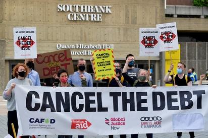 Ακτιβιστές της Global Justice Now διαμαρτύρονται έξω από τον χώρο της ετήσιας γενικής συνέλευσης της HSBC στο Southbank, στο Λονδίνο, στις 28 Μαΐου 2021. REUTERS/Toby Melville