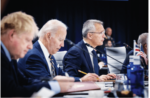Στη σύνοδο του ΝΑΤΟ στη Μαδρίτη (30 Ιουνίου 2022) ο αμερικανός πρόεδρος δήλωσε ότι οι ΗΠΑ θα διατηρήσουν την υποστήριξή τους «όσο χρειάζεται ώστε η Ρωσία να μη νικήσει την Ουκρανία». Ανέφερε ότι για την τρέχουσα οικονομική κατάσταση την ευθύνη φέρει αποκλειστικά η Ρωσία[26] η οποία δρα κακόβουλα ώστε να αποσταθεροποιήσει κοινωνικά και πολιτικά τις χώρες της Δύσης.