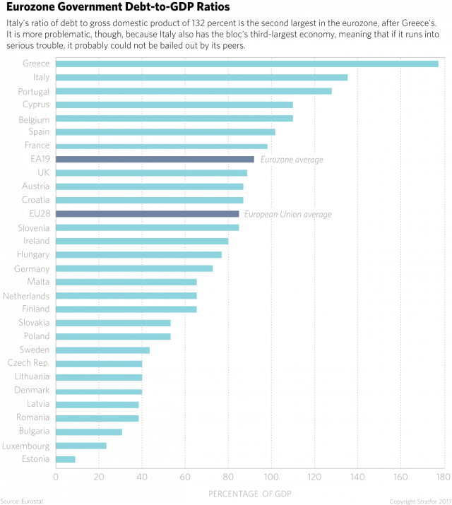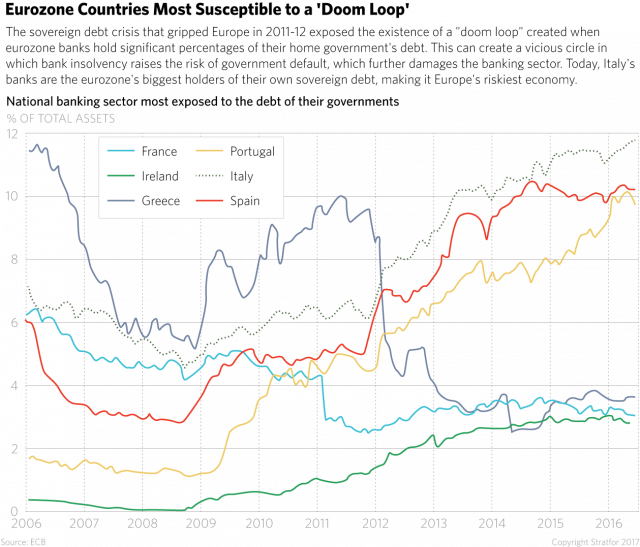 Την ίδια ώρα, τα οικονομικά ρίσκα παραμένουν, ιδιαίτερα στην Ιταλία. Η τρίτη μεγαλύτερη οικονομία της ευρωζώνης έχει το δεύτερο μεγαλύτερο χρέος ως ποσοστό του ΑΕΠ (132,4% του ΑΕΠ), ενώ ο τραπεζικός της κλάδος -που επιβαρύνεται με «κόκκινα» δάνεια ύψους 276 δισ. ευρώ- σχοινοβατεί στο χείλος της κρίσης. Στα προβλήματά της προστίθεται και το γεγονός πως η Ιταλία είναι το πιο ευάλωτο μέλος της ευρωζώνης στο «βρόχο της καταστροφής»: οι ιταλικές τράπεζες είναι οι μεγαλύτεροι κάτοχοι ιταλικών κρατικών ομολόγων, που αντιστοιχεί σε σχεδόν 12% του συνολικού ενεργητικού του τραπεζικού κλάδου.