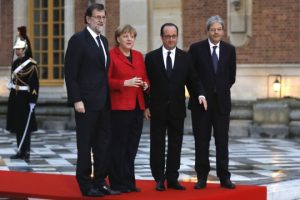 Προχθές, όμως, σε «μίνι σύνοδο» στις Βερσαλλίες εμφανίστηκαν οι πρώτοι «πρόθυμοι» υπέρ μιας Ευρώπης των πολλών ταχυτήτων! Οι ηγέτες της Γερμανίας, της Γαλλίας, της Ιταλίας και της Ισπανίας. Είναι οι χώρες που αναφέρονταν στον πρώτο κύκλο του πρώτου Σεναρίου του 1989!
