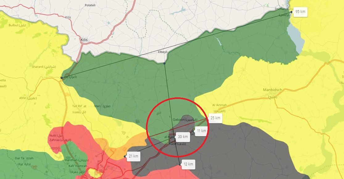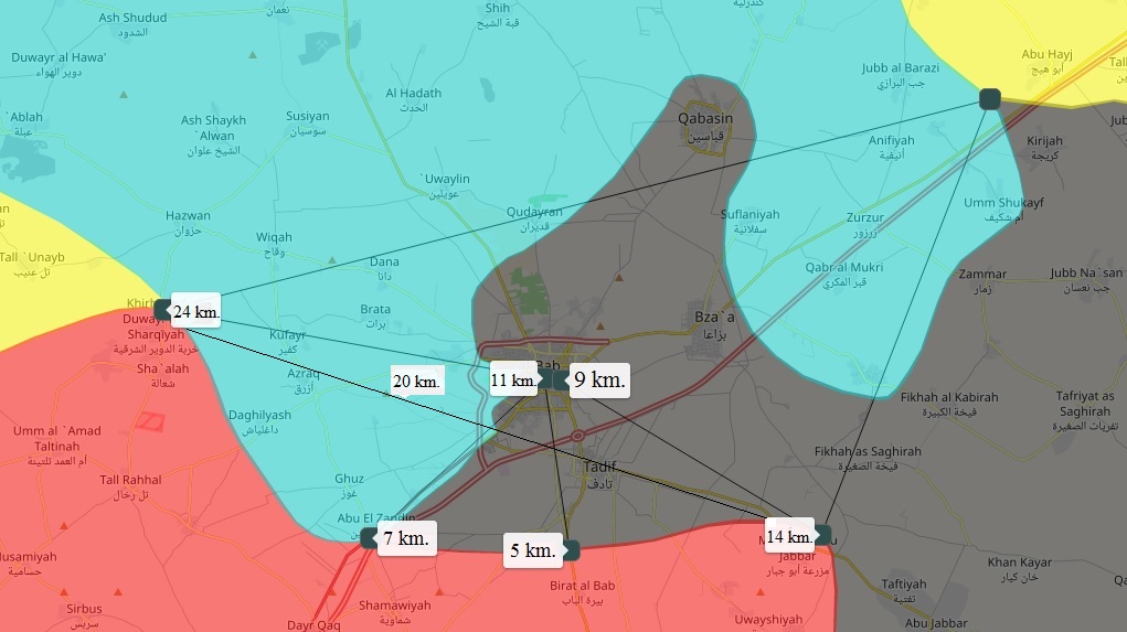 - Για του λόγου το αληθές, το ίδιο χρονικό διάστημα, όπως προκύπτει από την σύγκριση των δύο χαρτών, οι καθεστωτικές δυνάμεις έχουν προωθηθεί Α-ΒΑ του Χαλεπίου, σε τέτοιο βαθμό που έχουν μειώσει την απόστασή τους από ΝΔ και προς το κέντρο της Al-Bab στα 7 από τα 21 χλμ. (!) (ως σημείο αναφοράς λαμβάνεται το τριπλό σημείο επαφής SAA – Daesh – FSA/ΤΕΔ και SAA – Daesh – YPG/ SDF, στους δύο χάρτες αντιστοίχως), στα 5 από τα 12 χλμ. σε ευθεία από Ν προς Β (μεταξύ Birat al Bab και Tadif), ενώ οι αποστάσεις από τα δύο άκρα, στα οποία αναπτύσσονται στην παρούσα φάση οι δυνάμεις του Μπασάρ Αλ Άσαντ και οι σύμμαχοί τους, απέχουν από την Al-Bab 11 χλμ. (το Δ) και 9 χλμ. (το Α), αντιστοίχως. (Μεταξύ τους τα δύο άκρα απέχουν 20 χλμ.)