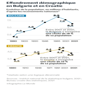 και τη Βουλγαρία, προϊδεάζει μια γενικότερη τάση (από την οποία η Ελλάδα μάλλον δε θα ξεφύγει) και απεικονίζεται στο ακόλουθο παραστατικό γράφημα της εφημερίδας Le Monde, εντός του δημοσιεύματος του Jean-Baptiste Chastand στις 26-1-2022, με τίτλο «Η Βουλγαρία και η Κροατία βρίσκονται ακόμη πιο ερημωμένες από το αναμενόμενο» (La Bulgarie et la Croatie se découvrent encore plus dépeuplées que prévu). Τι δείχνουν τα στοιχεία του εν λόγω γραφήματος ; Την εξέλιξη του πληθυσμού των δυο χωρών από το 1880 έως το 2021. Η πορεία της πληθυσμιακής καμπύλης της Βουλγαρίας δείχνει ότι μεταξύ 2001 και 2021 ότι ο πληθυσμός της έπεσε κατά 18%, μετά από μια διαρκή διαχρονική ανοδική πορεία μέχρι τότε. Η πορεία της πληθυσμιακής καμπύλης της Κροατίας δείχνει ότι μεταξύ 2001 και 2021 ότι ο πληθυσμός της έπεσε κατά 12%, μετά από μια διαρκή διαχρονική ανοδική πορεία μέχρι τότε επίσης.