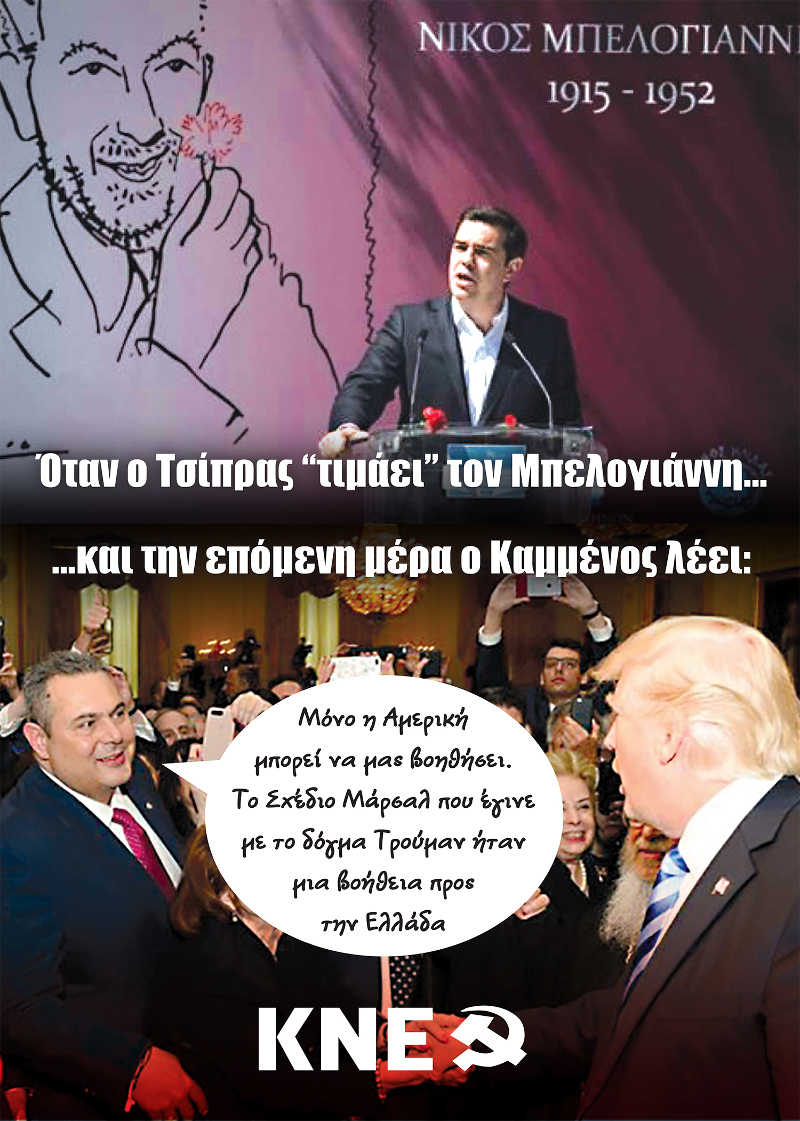 «Όταν ο Τσίπρας “τιμάει” τον Μπελογιάννη και την επόμενη μέρα ο Καμμένος λέει: “Το σχέδιο Μάρσαλ που έγινε με το δόγμα Τρούμαν ήταν μία βοήθεια προς την Ελλάδα”», σχολιάζει στην αφίσα η ΚΝΕ.