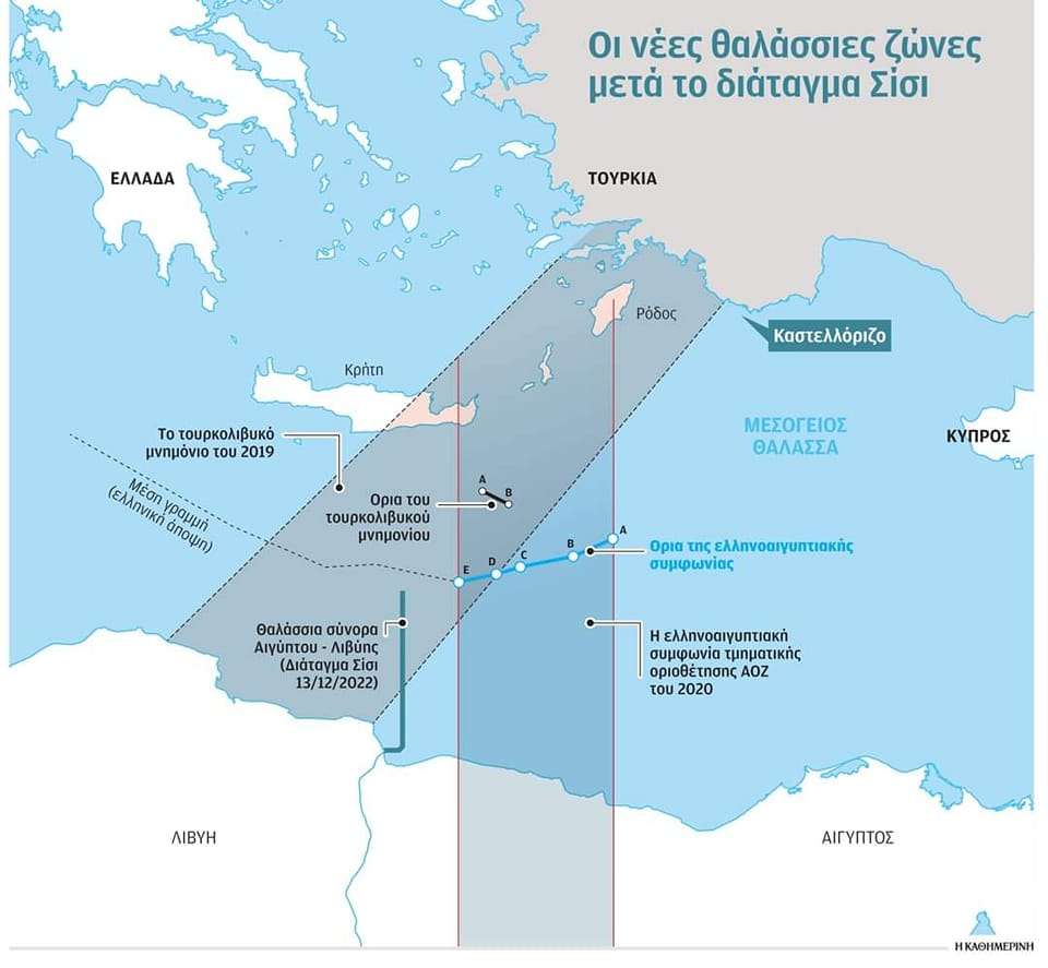 Η Καθημερινή «ντρέπεται», φαίνεται, να προεκτείνει τη μέση γραμμή κάτω από την περιοχή οριοθέτησης της ΑΟΖ μεταξύ Ελλάδας και Αιγύπτου, ώστε να μην φανεί στους αναγνώστες της ότι η Ελλάδα αποδέχθηκε μειωμένη επήρεια στα ελληνικά νησιά! Αυτήν την παραχώρηση, κυβερνητικά στελέχη την θεωρούν ως προθάλαμο υποχωρήσεων έναντι της Τουρκίας σε σχέση με την ΑΟΖ του συμπλέγματος των νησιών του Καστελλορίζου.