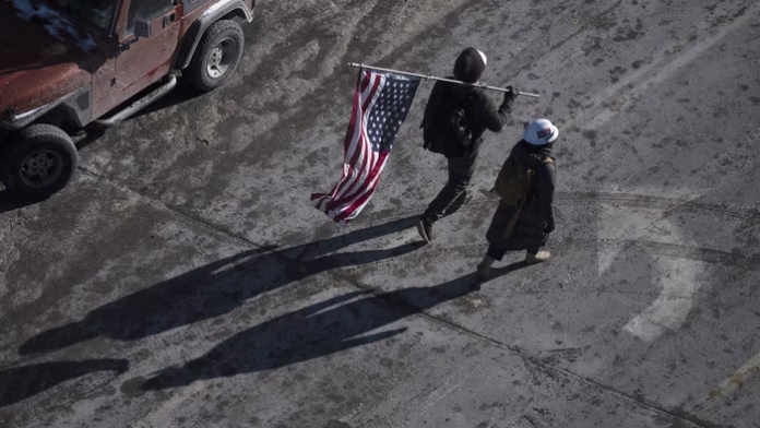 Ένα άτομο κρατά μια αμερικανική σημαία στη λεωφόρο Nicollet μετά από μια θανατηφόρα πυροβολιστική επίθεση από ομοσπονδιακούς πράκτορες εκεί στις 24 Ιανουαρίου 2026, στη Μινεάπολη