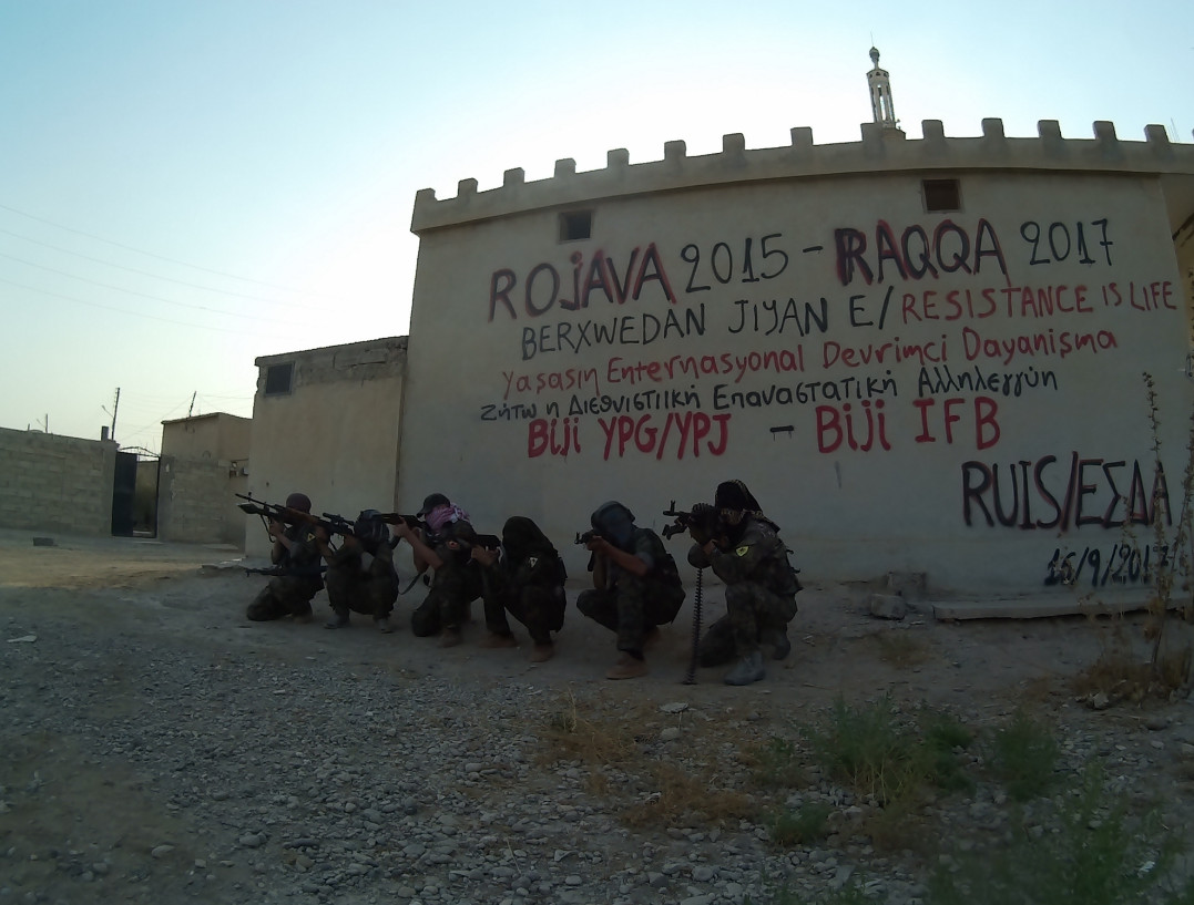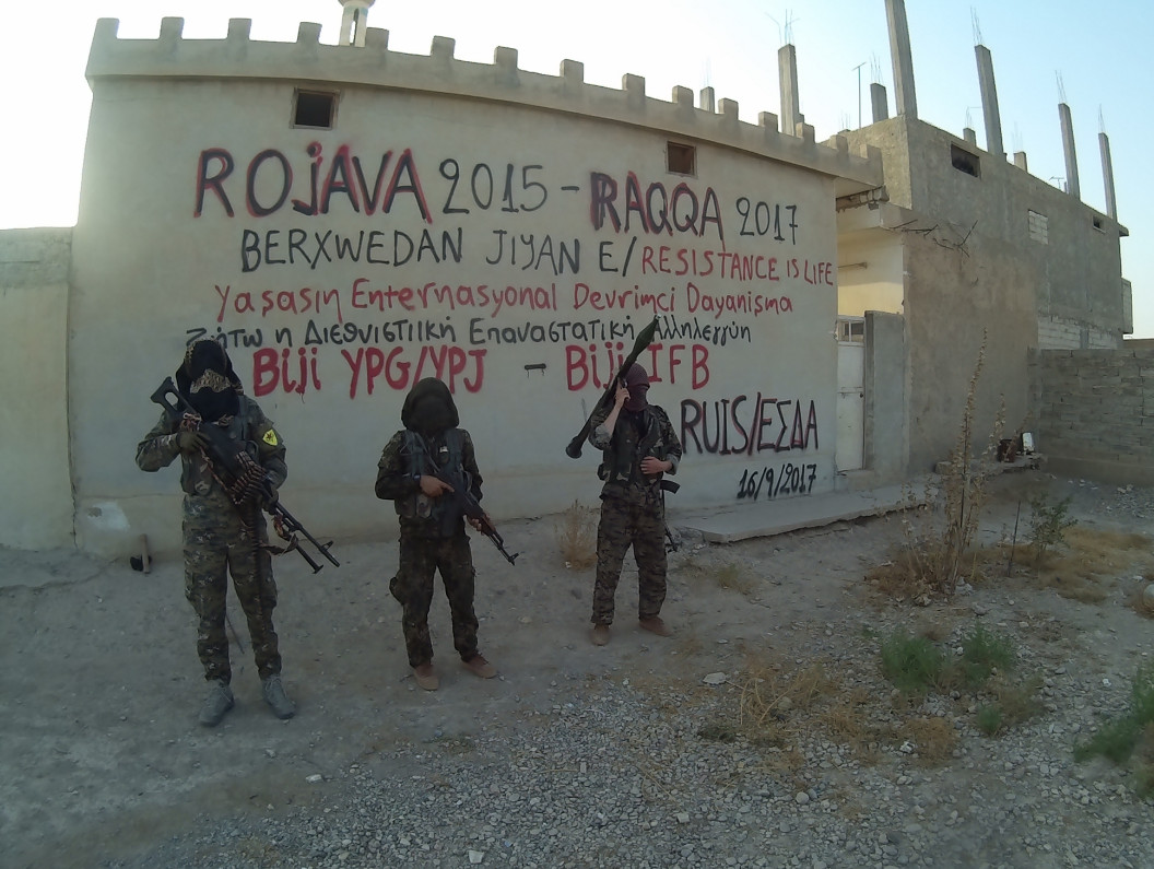 Ελληνες μαχητές στη Ράκα, να πολεμούν για την απελευθέρωση της από τους τζιχαντιστές απεικονίζονται σε φωτογραφίες που ανέβηκαν στον ιστότοπο του αντιεξουσιαστικού χώρου.