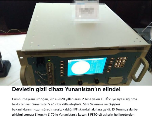 Μετά την απόπειρα πραξικοπήματος της 15ης Ιουλίου, το IFF (Σύστημα Αναγνώρισης Φίλων και Εχθρών) και οι συσκευές νυχτερινής όρασης, οι οποίες αποσυναρμολογήθηκαν από το ελικόπτερο από 8 στρατιώτες του FETO που κατέφυγαν στην Ελλάδα με το Sikorsky S-70, βρίσκονται ακόμη στα χέρια των ελληνικών μυστικών υπηρεσιών! Ο καθένας από τους 8 στρατιώτες αναζητείται με ανταμοιβή 10 εκατομμύρια TL (τουρκικές λίρες) …