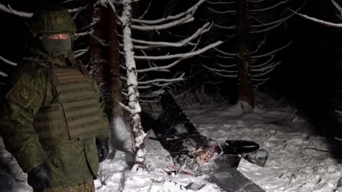 Το ρωσικό υπουργείο Άμυνας δημοσίευσε βίντεο που δείχνει έναν στρατιώτη με κρυμμένο το πρόσωπο δίπλα σε συντρίμμια ενός drone και έναν χάρτη που φέρεται να δείχνει την πορεία των drones κατά την διάρκεια της επίθεσης.