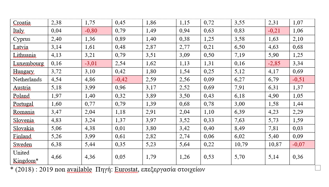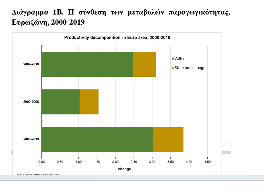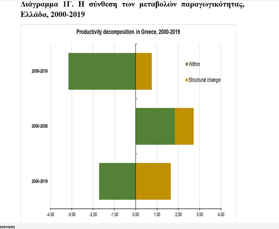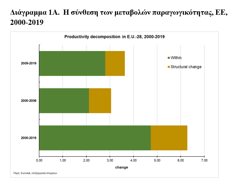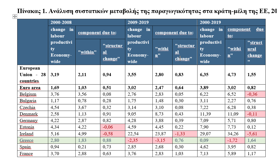 Οι εκτιμήσεις του Πίνακα 1 δείχνουν ότι τα περισσότερα κράτη-μέλη της ΕΕ και της Ζώνης του Ευρώ, αλλά και η ΕΕ και η Ζώνη του Ευρώ ως σύνολα, όταν αυξάνουν την παραγωγικότητα τους, (αφού τα περισσότερα κράτη-μέλη όπως βλέπουμε αύξησαν την παραγωγικότητα της εργασίας ανά ώρα την περίοδο 2000-2019), το κάνουν, κυρίως, αυξάνοντάς την εντός των κλάδων και λιγότερο με μετακίνηση πόρων, (διαρθρωτική αλλαγή). Υπάρχουν όμως τρεις εξαιρέσεις, μεταξύ των οποίων και η Ελλάδα. Αυτές, (Ελλάδα, Ιταλία, Λουξεμβούργο), έχουν ισχνή μεταβολή στην παραγωγικότητα, αν όχι στασιμότητα διότι, ενώ η διαρθρωτική αλλαγή είχε σημαντική θετική συμβολή, η εσωτερική παραγωγικότητα των κλάδων ανά ώρα εργασίας είχε αρνητική συμβολή και, έτσι, το ισχνό τους αποτέλεσμα ήταν προϊόν της αντίθετης φοράς των δύο διεργασιών.