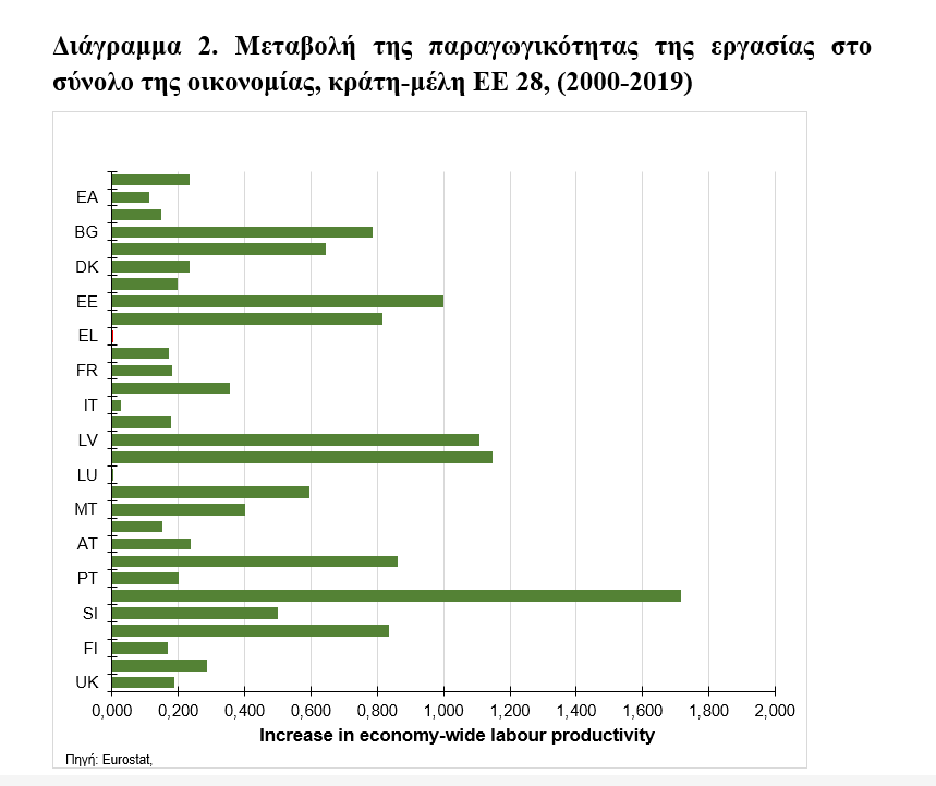 Στο Διάγραμμα 2 εμφανίζεται η, αποκλίνουσα σε σχέση με τα περισσότερα άλλα κράτη-μέλη της ΕΕ, στασιμότητα της παραγωγικότητας της εργασίας στην Ελλάδα μεταξύ 2000 και 2019. Αυτό είναι αποτέλεσμα των δύο αντίρροπων τάσεων δηλαδή της αρνητικής συμβολής από την παραγωγικότητα στο εσωτερικό των κλάδων και της θετικής συμβολής λόγω της διαρθρωτικής αλλαγής. Συνολική μεταβολή μικρότερη του 1% εμφανίζει η Ελλάδα (0,49%) και το Λουξεμβούργο (0,25%) το οποίο όμως για το έτος 2019 εμφανίζει επίπεδο παραγωγικότητας υπερτριπλάσιο από αυτό της Ελλάδας (65,86 έναντι 18,51).