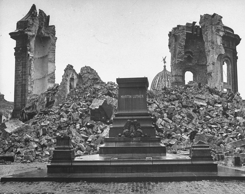 Δρέσδη 1945: Ερείπια. Ανάμεσά τους και ο Μαρτίνος Λούθηρος, ο εισηγητής της αίρεσης του Προτεσταντισμού…Εμβληματική εικόνα της δεύτερης αυτοκτονίας της Ευρώπης.