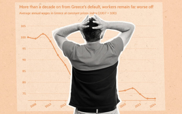 Άρα το γράφημα όχι μόνο είναι σωστό, αλλά δείχνει μια δομική αδυναμία της ελληνικής οικονομίας να ανακάμψει. Βέβαια υπήρξαν μνημόνια και λάθος πολιτικοί χειρισμοί. Αυτά όμως συμβαίνουν και σε μεγάλες εταιρείες (με πρόσφατο παράδειγμα την Boeing). Αν δεί κάποιος τα στοιχεία πιο προσεκτικά, παρατηρεί ότι απο το 2009 μόνο η Ελλάδα δεν έχει σημείωσει ΚΑΜΜΙΑ ουσιαστική αύξηση μισθών σε σχέση με τους υπόλοιπους. Καθόδευσε με ευθεία γραμμή απο το 100% το 2009 στο 80% το 2013, έμεινε εκεί μέχρι το 2015, έπεσε στο 78% το 2016-17 και μετά βουλοπλέει στο 75% το 2018-2023, χωρίς στατιστικά ίχνη ανάκαμψης. Οι υπόλοιπες οικονομίες, πλην της Ιταλίας, κινούνται ανοδικά απο το 2018 και εξής.