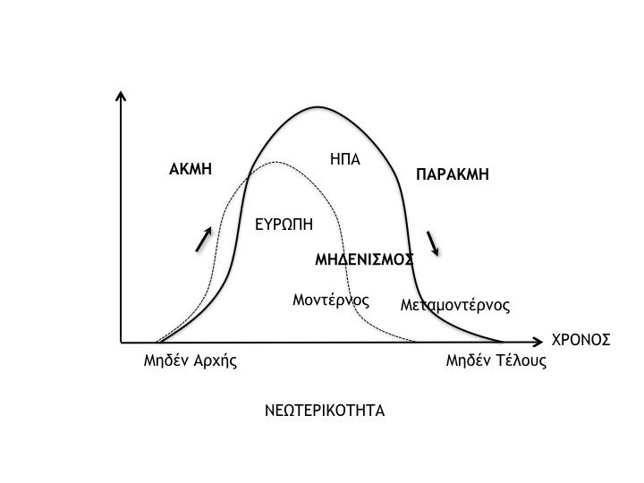 Η απεικόνιση αυτή διαφέρει, ως προς την κωδωνόσχημη «κανονικότητα», διότι στη φάση του Μοντερνισμού η καμπύλη διακόπτεται από το σκαμπανέβασμα των παγκοσμίων πολέμων και των επαναστάσεων του πρώτου μισού του 20ου αιώνα. Σκαμπανέβασμα που αντιστοιχεί σε παρακμή και με τις δύο τυπολογικές έννοιές της: α) πτώση στην κατάσταση μηδέν και β) υποστροφή στον δεσποτισμό, με αποτέλεσμα την ολική έκλειψη του «προμηθεϊκού» υποκειμένου της Νεωτερικότητας: του Αστού (και του αντι-Αστού). Επίσης: στη μεταμοντέρνα φάση έχουμε μια πρωτοφανήανάπτυξη-ακμή του Τεχνοσυστήματος, αλλά και των παραμέτρων της παρακμής, ως ακάθεκτης αποσύνθεσης της ατομικότητας, μαζί επίσης με τάσεις «νεοφεουδαρχικού»υποστροφικού δεσποτισμού.