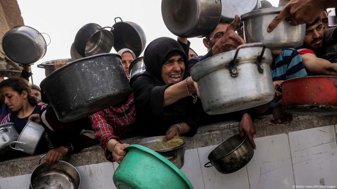 Στις 24 Απριλίου 2025, πολίτες περιμένουν στην ουρά με κατσαρόλες για να λάβουν γεύμα από φιλανθρωπική κουζίνα στη Μπέιτ Λάχια του βόρειου τμήματος της Γάζας. Πολλοί εξαρτώνται από τη βοήθεια των οργανισμών.