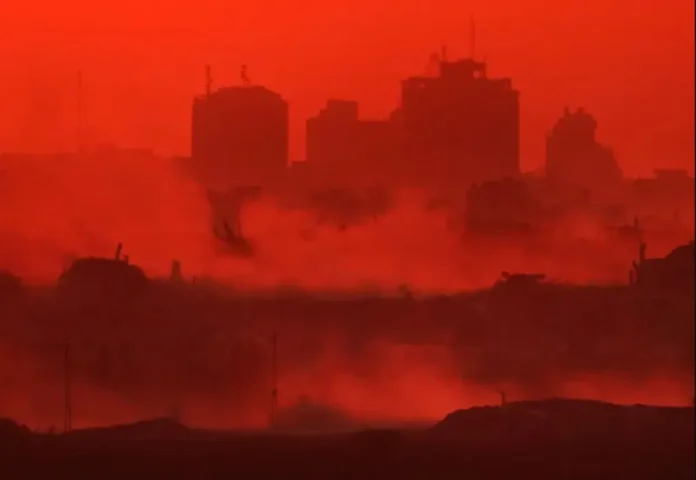 Κατεστραμμένα κτίρια στη Λωρίδα της Γάζας φωτογραφίζονται κατά τη δύση του ηλίου από μια θέση πέρα από τα σύνορα στο νότιο Ισραήλ στις 15 Ιουλίου 2025.