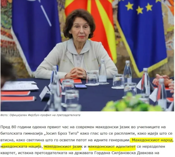 Πριν από 80 χρόνια, το πρώτο μάθημα της σύγχρονης μακεδονικής γλώσσας αντηχούσε στις τάξεις του λυκείου της Μπίτολα «Γιόσιπ Μπροζ Τίτο» σαν φωνή που φούντωσε, σαν ιδέα που αποτυπώθηκε, σαν φως που φώτιζε το μονοπάτι των επόμενων γενεών. Ο μακεδονικός λαός, το μακεδονικό έθνος, η μακεδονική γλώσσα και η μακεδονική ταυτότητα είναι ένα αχώριστο κουαρτέτο, τόνισε η Πρόεδρος του κράτους Γκόρντανα Σιλιάνοφσκα Ντάβκοβα σε εκδήλωση στην ακαδημία στο Μοναστήρι/ Μπίτολα αφιερωμένη στην επέτειο της διεξαγωγής του πρώτου μαθήματος στη «σύγχρονη μακεδονική γλώσσα».