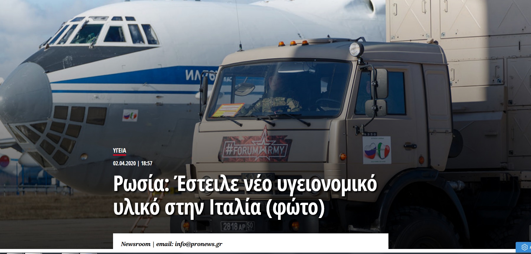 Υπενθυμίζεται ότι στα μέσα του 2020 η Ρωσία είχε αποστείλει στην Ιταλία με αεροσκάφη Ilyushin Il-76 οκτώ ιατρικές ομάδες και πάνω από εκατό στρατιωτικούς ιολόγους και επιδημιολόγους.