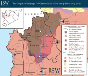 Οι δυνάμεις κατά του Assad που ελέγχουν μεγάλο μέρος της επαρχίας Ιντλίμπ και τμήματα γειτονικών επαρχιών Λατάκια και Χαλέπι αποτελούν την τελευταία υπολειπόμενη περιοχή της Συρίας, εκτός του ελέγχου του καθεστώτος Assad, τις Συριακές Δημοκρατικές Δυνάμεις (SDF) ), και τήν κατεχόμενη απο την Τουρκία περιοχή. Οι δυνάμεις ανταρτών στο Ευρύτερο Ιντλίμπ απειλούν την ασφάλεια της βασικής βάσης της Ρωσίας στη Συρία με όπλα και έμμεση ανάφλεξη. Αυτές οι δυνάμεις ελέγχουν επίσης μια έκταση της βασικής οδού Μ5, η οποία συνδέει τις δύο μεγαλύτερες πόλεις της Συρίας τη Δαμασκό και το Χαλέπι. Η Hay’at Tahrir al Sham (HTS), που συνδέεται με την Αλ Κάιντα, δεσπόζει στον έλεγχο του Ευρύτερου Ιντλίμπ, αν και το εμπλεκόμενο με την Τουρκία Μέτωπο Εθνικής Απελευθέρωσης (NLF) και μια σειρά μικρότερων παρατάξεων διατηρούν την παρουσία τους σε μεγάλο μέρος της περιοχής. Οι δυνάμεις υπέρ του καθεστώτος ξεκίνησαν την επίθεσή τους τον Μάιο του 2019 και έκτοτε κατέλαβαν αρκετές βασικές πόλεις, μεταξύ των οποίων ο Χαν Σέικουν στις 21 Αυγούστου, την Μααράτ αλ Νταμάν στις 28 Ιανουαρίου και το Σάρακιμ στις 7 Φεβρουαρίου.