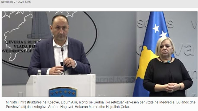 Ο υπουργός Υποδομών στο Κοσσυφοπέδιο, Λιμπούρν Αλίου, ανακοίνωσε ότι η Σερβία απέρριψε το αίτημα για επίσκεψη στη Μέντβετζα, στο Μπουγιάνοβατς και στο Πρέσεβο σε αυτόν και τρεις συναδέλφους του υπουργούς.