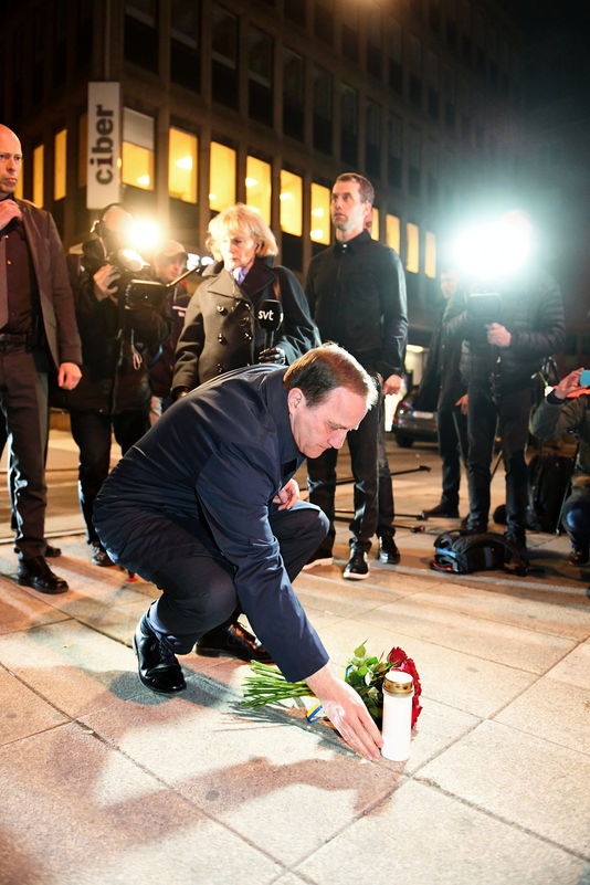 Το βράδυ της Παρασκευής, ο πρωθυπουργός της Σουηδίας Stefan Löfven, πολύ συγκινημένος άφησε λουλούδια και ένα κερί στο πεζοδρόμιο, μερικά μέτρα από το σημείο της επίθεσης. Είχε επιστρέψει εκτάκτως από το Göteborg, όπου είχε μεταβεί για να συμμετάσχει στο Συνέδριο του Σοσιαλ-δημοκρατικού κόμματος, το βράδυ του Σαββάτου. Κατά τη διάρκεια συνέντευξης τύπου ο πρωθυπουργός εξέφρασε την αποφασιστικότητά του: «Ο στόχος της τρομοκρατίας είναι να υπονομεύσει την δημοκρατία. Αλλά οι πράξεις της δεν θα πλήξουν ποτέ την Σουηδία, το γνωρίζουμε. Δεν μπορείτε να μας διχάσετε, δεν μπορείτε να ελέγξετε τη ζωή μας, δεν μπορείτε ποτέ να κερδίσετε».