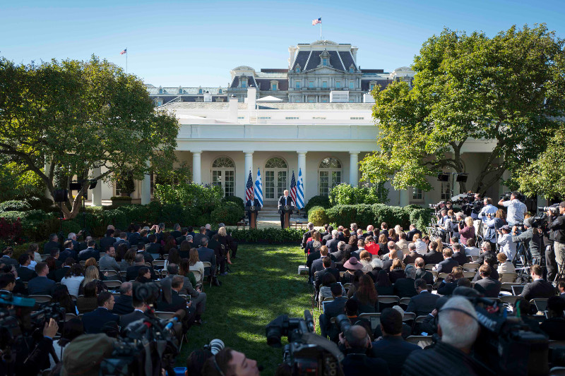 «Έχουμε εμπιστοσύνη στην Ελλάδα», είπε ο αμερικανός πρόεδρος κατά τη διάρκεια της συνέντευξης Τύπου στους κήπους του Λευκού Οίκου, εγκωμιάζοντας τις «δύσκολες αποφάσεις» που πήρε η Αθήνα τα τελευταία χρόνια.
