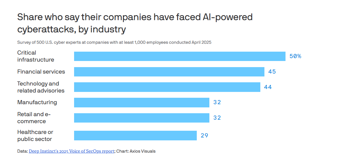 Το 50% των ερωτηθέντων σε οργανισμούς κρίσιμων υποδομών δήλωσε ότι έχει ήδη αντιμετωπίσει επίθεση με χρήση τεχνητής νοημοσύνης κατά το τελευταίο έτος.