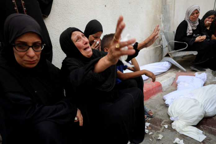 Μαυροφορεμένες γυναίκες θρηνούν, κατά τη διάρκεια κηδείας των Παλαιστινίων που σκοτώθηκαν σε ισραηλινά πλήγματα, στο νοσοκομείο Αλ Σίφα, στην Γάζα (REUTERS/Mahmoud Issa).