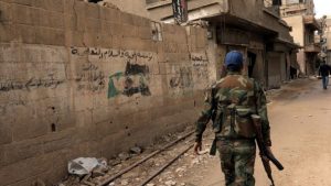 Syrian soldiers walk around at a street in Zamalka town, Eastern Ghouta, in the countryside of Damascus, Syria, 08 April 2018. The city was recently recaptured by the Syrian government during a military offensive that was launched more than a month ago against rebels. EPA, YOUSSEF BADAWI