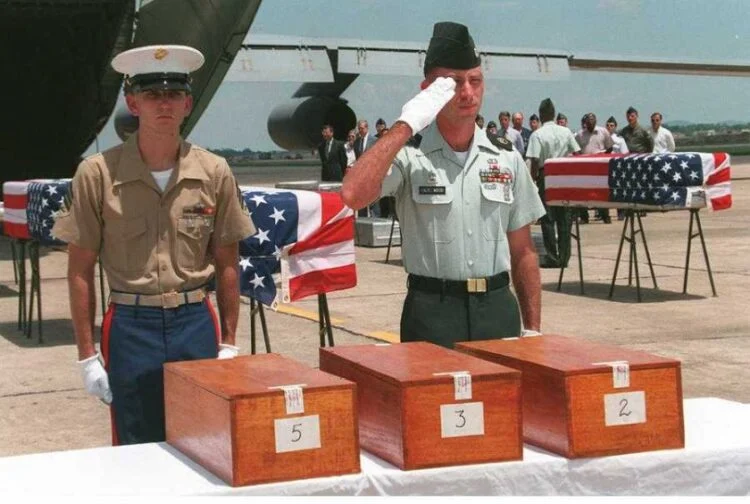 Ο δεκανέας Hazel Wood (δεξιά) χαιρετά στρατιωτικά προτού παραλάβει ξύλινα κιβώτια που περιείχαν τα λείψανα Αμερικανών στρατιωτών, κατά τη διάρκεια τελετής επαναπατρισμού αγνοουμένων (MIA), στις 10 Ιουνίου 1996, στο αεροδρόμιο του Ανόι. Το Ανόι παρέδωσε στις ΗΠΑ, τα υποτιθέμενα λείψανα επτά αγνοουμένων. Τα λείψανα, τοποθετημένα σε φέρετρα καλυμμένα με την αμερικανική σημαία, μεταφέρθηκαν αεροπορικώς στη Χαβάη για να γίνει η ταυτοποίησή τους (φωτ. αρχείου: Hoang Dinh NAM)