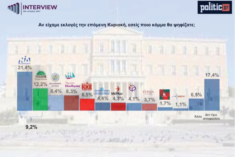 Στήν πρόθεση ψήφου, ἡ Νέα Δημοκρατία παραμένει πρώτη, τό ποσοστό της ὅμως ἔχει συρρικνωθεῖ στό 21,4%, τό ὁποῖο ἐκτιμᾶται μέ τίς ἀναγωγές ὅτι στήν κάλπη μπορεῖ νά φθάσει τό 25,9%. Ἀκολουθεῖ τό ΠΑΣΟΚ μέ 12,2% (μέ ἀναγωγή 14,8%), ἡ Ἑλληνική Λύση μέ 8,4% (10,1%), ἡ Πλεύση Ἐλευθερίας μέ 8,3% (10%), τό ΚΚΕ μέ 6,5% (7,8%), ἡ Φωνή Λογικῆς μέ 4,4% (5,2%) τό Μέρα25 μέ 4,3% (5%), τό Κίνημα Δημοκρατίας μέ 4,1% (5,3%) ὁ ΣΥΡΙΖΑ μέ 3,7% (4,5%) ἡ Νέα Ἀριστερά μέ 1,7% (1,4%) καί ἡ Νίκη μέ 1,1% (2,1%).