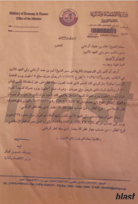 Το Blast έγραψε ότι μεταξύ του 2009 και του 2011, ο εμίρης του Κατάρ είχε πραγματοποιήσει μεταφορές προς όφελος πολλών δημοσίων προσώπων, όπως οι Μπερνάρ – Ανρί Λεβί (9,1 εκατομμύρια ευρώ), Κάρλα Μπρούνι – σύζυγος του τότε Προέδρου της Δημοκρατίας Σαρκοζί – (6 εκατομμύρια), Λωράν Πλατινί (9,1 εκατομμύρια) και η ΜΚΟ Human Rights Watch (3 εκατομμύρια), σε αντάλλαγμα για την υποστήριξή τους στην περιφερειακή πολιτική του Κατάρ.