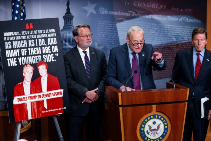 epa12273337 US Senate Minority Leader Chuck Schumer (C), along with Democratic Senators Gary Peters from Michigan (L) and Richard Blumenthal from Connecticut (R), speaks about US President Donald Trump’s relationship with late sex offender Jeffrey Epstein in the US Capitol in Washington, DC, USA, 30 July 2025. EPA, JIM LO SCALZO