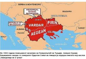 Αυτός είναι πλαστογραφημένος χάρτης των Τούρκων, του 1993, με τις «3 Μακεδονίες», όπως τον δημοσίευσε η Σκοπιανή εφημερίδα Βέτσερ, με την ως άνω σχετική λεζάντα στη βουλγαροσλαβική γλώσσα των Σκοπιανών. Ο χάρτης βρίσκεται στο βιβλίο «Η Μακεδονία δεν είναι ελληνική», σ. 81, των Τούρκων στρατηγών Κουρμάι Μπασκανλίγκι (βοηθός Αρχηγός του Επιτελείου της Τουρκίας) και του στρατηγού Οζνάλ Ερντογάν, το οποίο τυπώθηκε στην Άγκυρα, το 1993. Κάθε σχόλιο περιττεύει.
