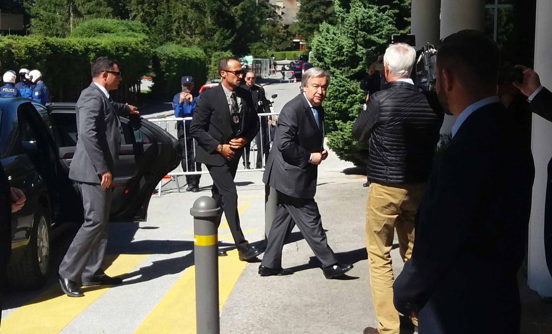 Στη συνέχεια έφτασε ο γ.γ. του ΟΗΕ, ο οποίος είχε σύντομη συνομιλία με τους συμμετέχοντες στη Διάσκεψη. Ακολούθως ο γ.γ. του ΟΗΕ φωτογραφήθηκε με τους ηγέτες των δύο κοινοτήτων, στη συνέχεια με τους ηγέτες και τους διαπραγματευτές και με τον κ. Άιντε, και μετά με τους επικεφαλής όλων των συμμετεχουσών πλευρών στη Διάσκεψη.