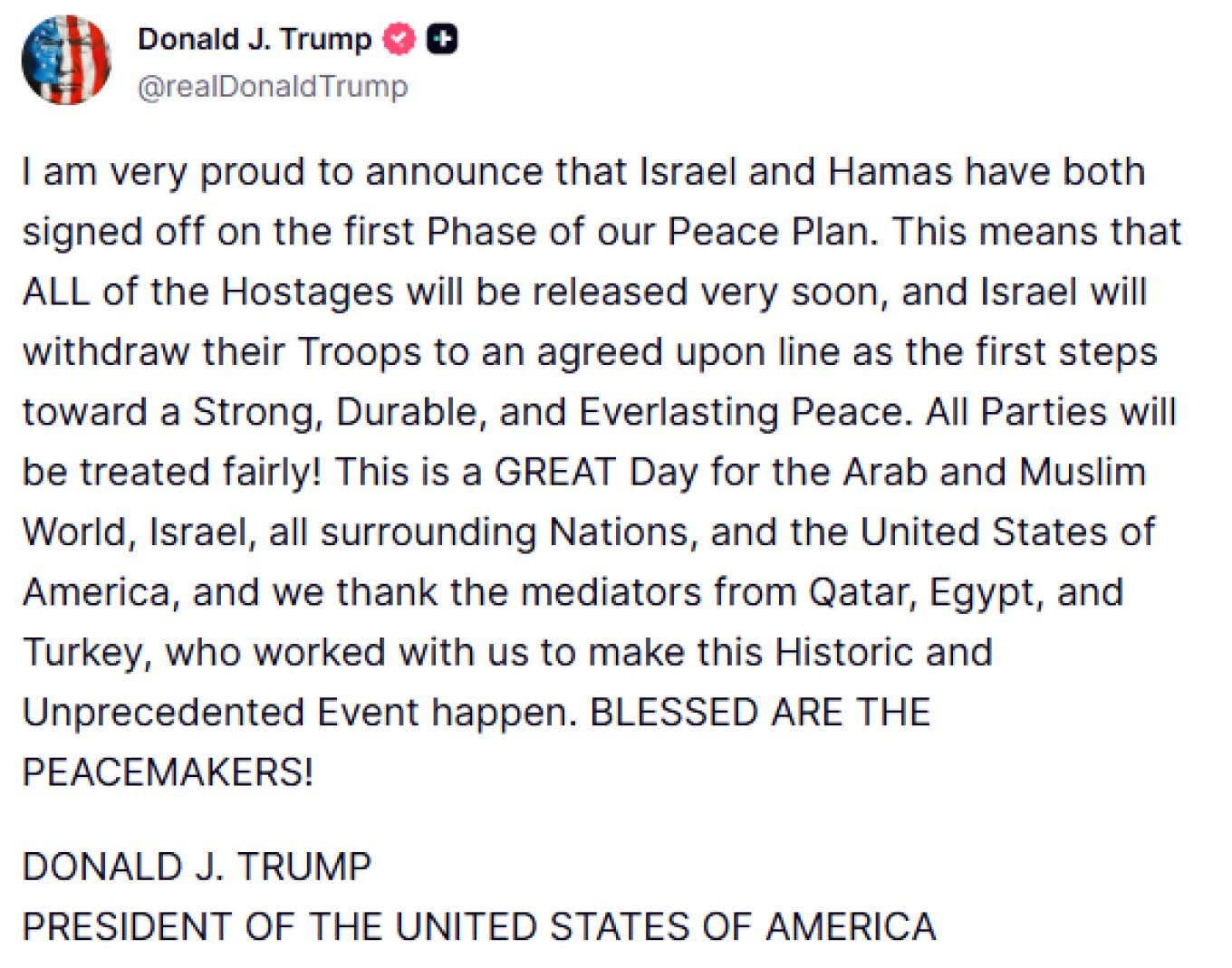 2. Αίγυπτος, Κατάρ, Τουρκία και ΗΠΑ ήταν τα κράτη που ευχαρίστησε ο Νετανιάχου για την επίτευξη της Αρχικής Συμφωνίας Ειρήνης του πολέμου Ισραήλ εναντίον Χαμάς, ενώ η ”πρόθυμη Ιταλία” επιθυμεί να στείλει άμεσα στρατεύματα ειρηνευτικής δύναμης, κάτι που θεωρείται δεδομένο και θα γίνει άμεσα.