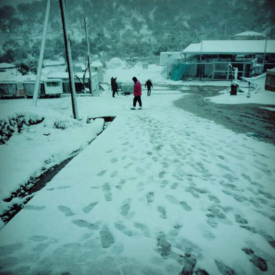 Ισχυρή είναι η χιονόπτωση που πλήττει και σήμερα τη Λέσβο, δημιουργώντας προβλήματα στο νησί και δυσχεραίνοντας τις ήδη δύσκολες συνθήκες κάτω από τις οποίες αναγκάζονται να ζουν οι πρόσφυγες και μετανάστες στον καταυλισμό της Μόριας.