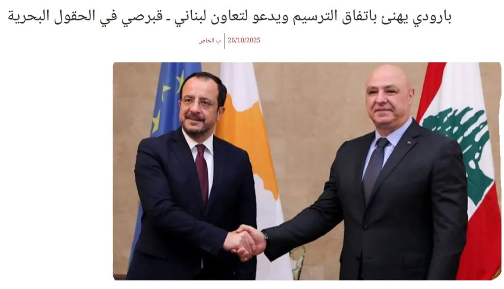 Ο Λίβανος χρειάζεται επίσης μια συμφωνία για την οριοθέτηση των θαλάσσιων και χερσαίων συνόρων με τη Συρία και για τη δημιουργία ενός τριμερούς σημείου σε αυτή την πλευρά μεταξύ Λιβάνου , Κύπρου και Συρίας. Υπάρχουν θετικές ενδείξεις με τη νέα συριακή κυβέρνηση».